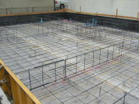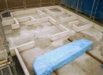 | ベースコンクリート打設後です。 夏場高温時の急速な乾燥や雨には注意が 必要です。 |